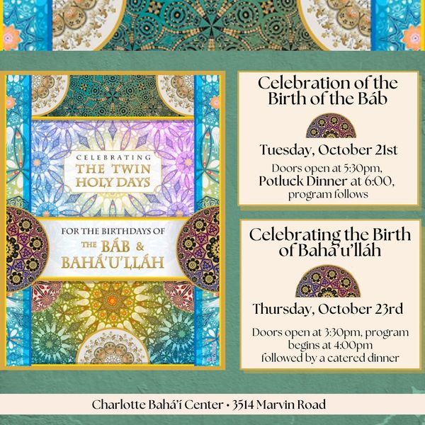 Join us for two celebrations. The first is Tuesday evening, October 21st with a potluck dinner. Doors open at 5:30pm, dinner starts at 6:00pm. The program will following celebrating the life of the Báb.